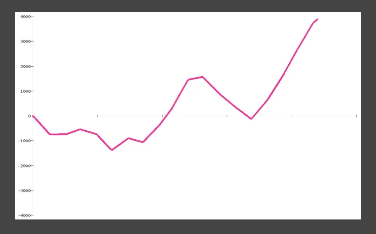 最後の連チャン前にグラフが大きく落ち込んでいるのは、700G、600Gハマりと連続で食らったため。