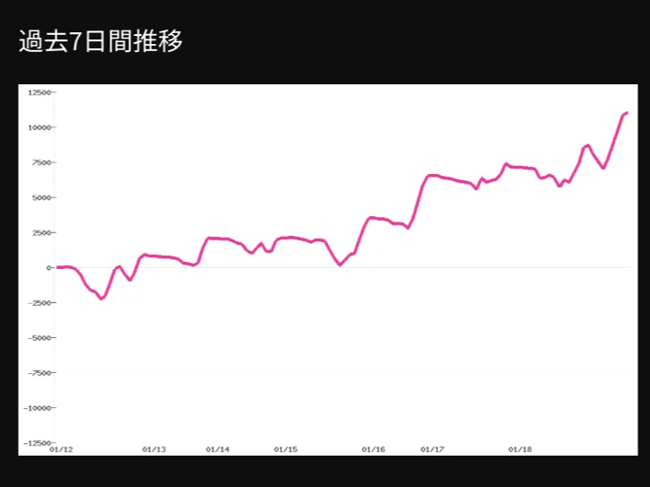 差枚自体は大したことない(+1,000枚弱)のですが、初当たりが軽く、3スルー以内に天国に行く台があったので、直近7日間のスランプグラフを確認したところ…